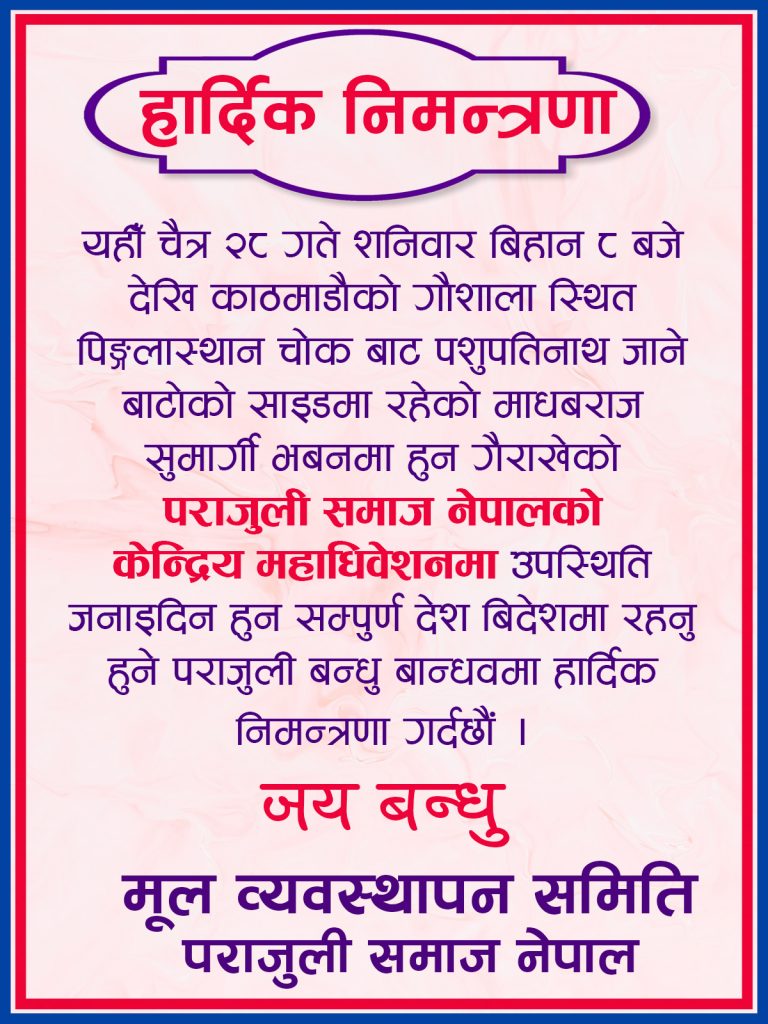 पराजुली समाज नेपालको केन्द्रीय महाधिबेशन तपसिलको मिति स्थान र समयमा हुने भयको पुन जानकारी गराउदै महाधिबेशनलाइ सभ्य अनि भब्य रुपमा सम्पन्न गर्नकालागी देश भरी रहनुहुने सम्पुर्ण पराजुली बन्धुहरुलाइ हार्दीक निमन्त्रणा गर्दछौ ।