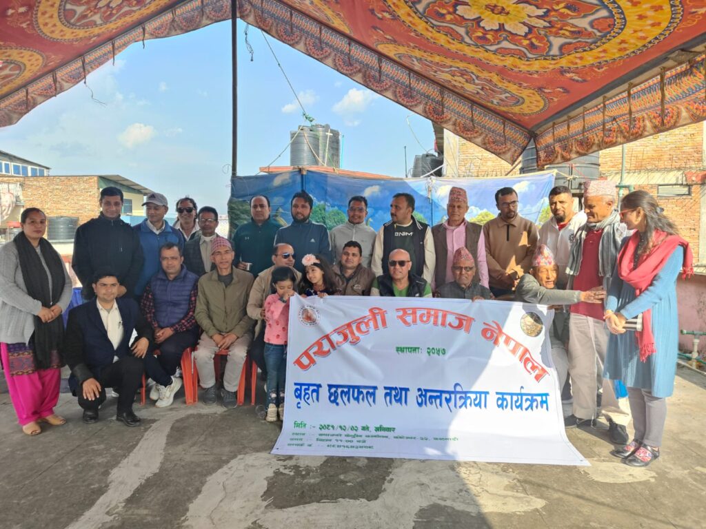 पराजुली समाज नेपाले आज मिति २०८१ साल चैत्र २ गते शनिवार केन्द्रीय कार्यालय कोटेश्वरमा बृहद् छलफल तथा अन्तक्र्रिया कार्यक्रम सम्पन्न गरेको छ । समाजका उपाध्यक्ष तथा संगठन विभाग प्रमुख दिवस पराजुलीको संयोजनमा आयोजित कार्यक्रममा प्रदेश प्रमुखहरु, जिल्ला संयोजकहरु, पुर्व पधाधिकारी एवं निवर्तमान पदाधिकारीको गरी ६० भन्दा पराजुली बन्धुहरुको उपस्थिति रहेको थियो । कार्यक्रमाका सभापतित्व समाजका अध्यक्ष विश्वम्भरकृष्ण पराजुलीले गर्नुभएको थियो भने विशेष अतिथिहरुमा पुर्व अध्यक्ष कुल प्रसाद पराजुली, पुर्व उपाध्यक्ष नवराज पराजुली, पुर्व उपाध्यक्ष केदार पराजुली, सल्लाहकार केशवप्रसाद पराजुली, बागमती प्रदेश अध्यक्ष राजन पराजुली, मधेस प्रदेश अध्यक्ष बलराम पराजुली, युवा समिति संयोजक भानुभक्त पराजुली, केन्द्रीय सचिव तुलसी प्रसाद पराजुली, सिन्धुपाल्चोक जिल्ला समन्वय समिति संयोजक उत्तम पराजुली, काठमाण्डौ जिल्ला संयोजक महेश पराजुली, काभ्रे जिल्ला सचिव कृष्ण पराजुली, भक्तपुर जिल्ला प्रतिनिधि मणिराम पराजुली, कौडिण्य महाँसंघका पुर्व सचिव पुरुषोत्तम पराजुली, केन्द्रीय सदस्य विशाल पराजुली, केन्द्रीय सदस्य राम बहादुर पराजुली, काभ्रेजिल्ला संयोजक हरी पराजुली, महिला उपाध्यक्ष अंजली उप्रेती पराजुली, ललितपुर जिल्ला संयोजक मुकुन्द प्रसाद पराजुली, समाजका महासचिव विष्णु प्रसाद पराजुली लगायतका विशेष अतिथिको उपस्थिति रहेको थियो भने बृहद् अन्तक्र्रियामा पदाधिकारी तथा समाजका आजीवन सदस्य तथा शुभचिन्तकहरुको विशेष उपस्थिति थियो जसमा केन्द्रीय सदस्य डोलराज पराजुली, श्याम पराजुली, रुक्सा पराजुली, अन्जली उप्रेती पराजुली, विष्णु तिमल्सिना पराजुली, पुन्य प्रसाद पराजुली, भेषराज पराजुली, नारायण पराजुली, बागमती प्रदेश सचिव शिशिर पराजुली, धुर्व पराजुली, जोगेन्द्र प्रसाद पराजुली, राम प्रसाद पराजुली, केन्द्रीय सदस्य राममणि पराजुली, युवा समिति सचिव केशव पराजुली, साहरी पराजुली, प्रविन पराजुली, भानु पराजुली, हरिप्रसाद पराजुली, राजन पराजुली, नवीन पराजुली, खुसी पराजुली, कृष्ण प्रसाद पराजुली, अमृता पराजुली, मछिन्द्र पराजुली, कृष्ण प्रसाद पराजुली, क्रान्ति पराजुली लगायतका बन्धुबान्धवहरुको विशेष उपस्थिति रहेको थियो ।