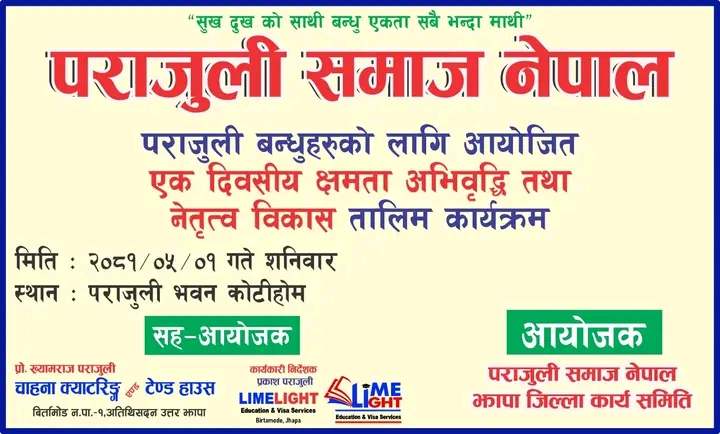 सुखदुखको साथी, बन्धु एकतानै सबैभन्दा माथि भन्ने मूख्य लक्ष्यलाई सिरोपर गरी पराजुली समाज नेपाल, झापा जिल्ला कार्य समितिको आयोजनामा एक दिवसीय क्षमता अभिबृद्धि तथा नेतृत्व विकास तालिम कार्यक्रम संचालन हुने भएको छ । मिति २०८१ भाद्र १ गते आयोजना हुने कार्यक्रमको सहआयोजन चाहना क्याटरिगं एण्ड टेन्ट हाउस तथा लाइमलाईट एजुकेसन एण्ड भिजा सर्भिसले गरेको छ । झापा माइधार स्थित कोटीहोम हलमा संचालन हुने तालिम कार्यक्रमबाट पराजुली बन्धहरुको ब्यक्तित्व तथा क्षमता विकासमा ठोस रुपमा विकास हुनगई समाजको बृद्धि एवं विकासका साथै आन्तरिक इच्छाशक्ति तथा उत्प्रेरणाको जागरण हुने विश्वासका साथ कार्यक्रमको आयोजना गरिएकोहो ।